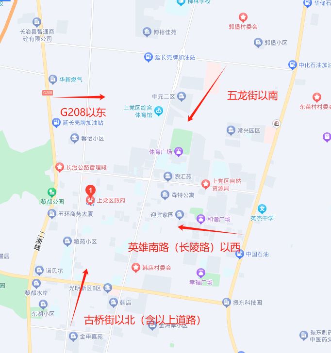 英雄南路(长陵路)以西、G208以东、五龙街以南、古桥街以北(含以上道路)区域管制范围内。